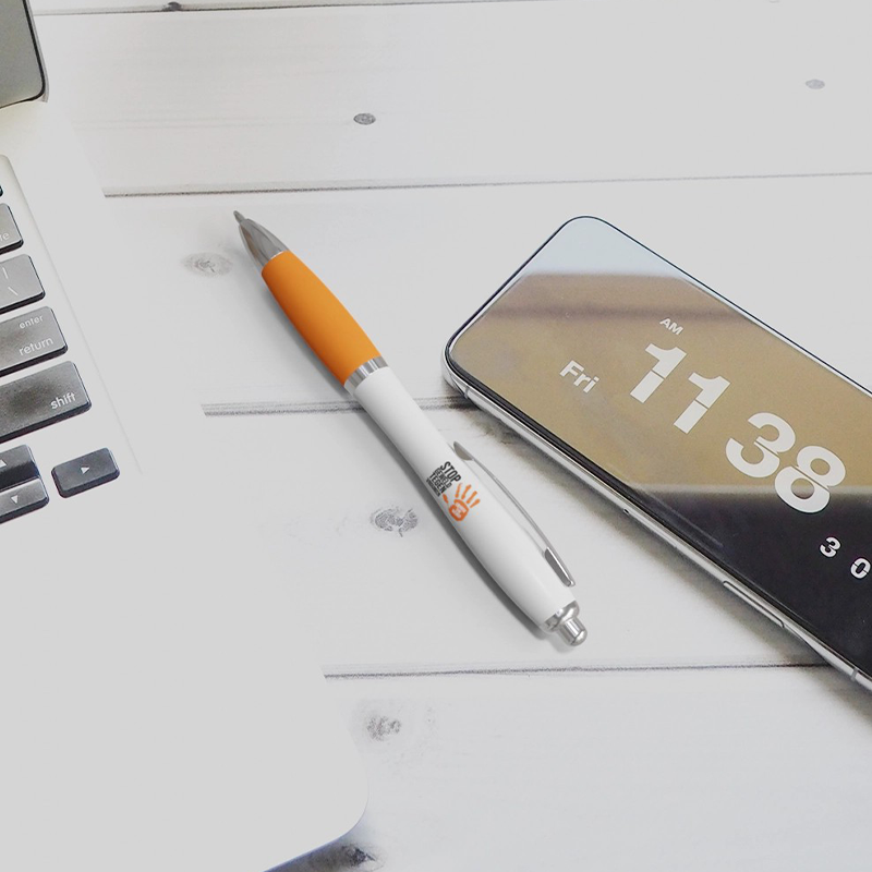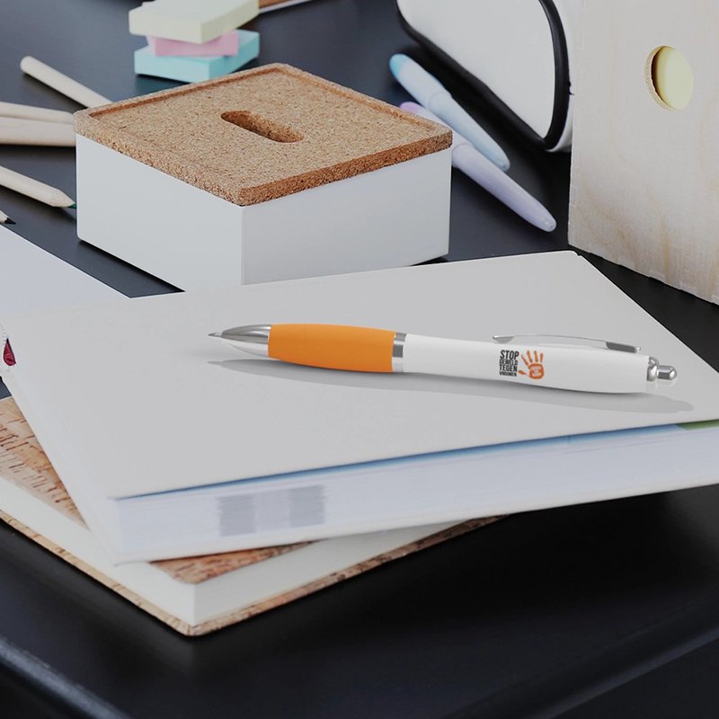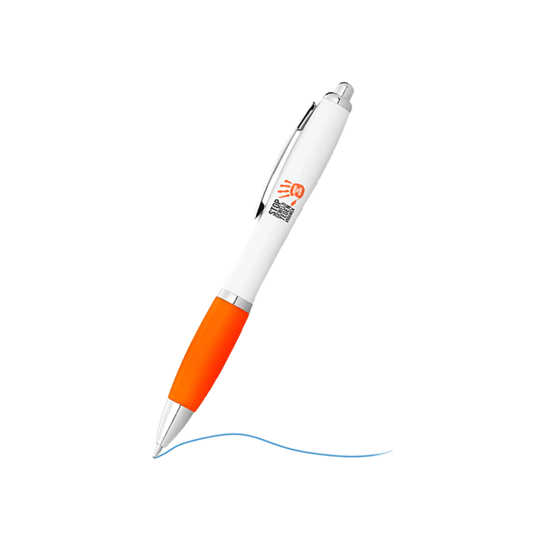 Balpen met klikmechanisme en soft touch greep. Blauwschrijvend. Bedrukt op 1 positie met Orange the World logo in full color.